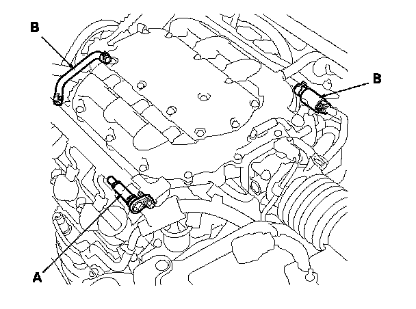 2. Check the PCV valve (A), hoses (B), and connections for leaks or restrictions.