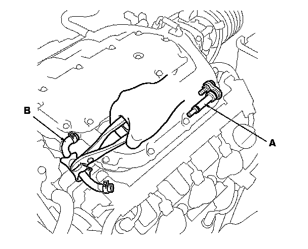 3. At idle, listen to the PCV valve (A) with a stethoscope as you lightly pinch the PCV hose (B) with your fingers or pliers several times. Each time the hose is pinched, the valve should click.