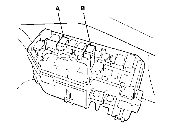 7. Remove PGM-FI main relay 1 (A) and ETCS control relay (B) from the under-hood fuse/relay box.