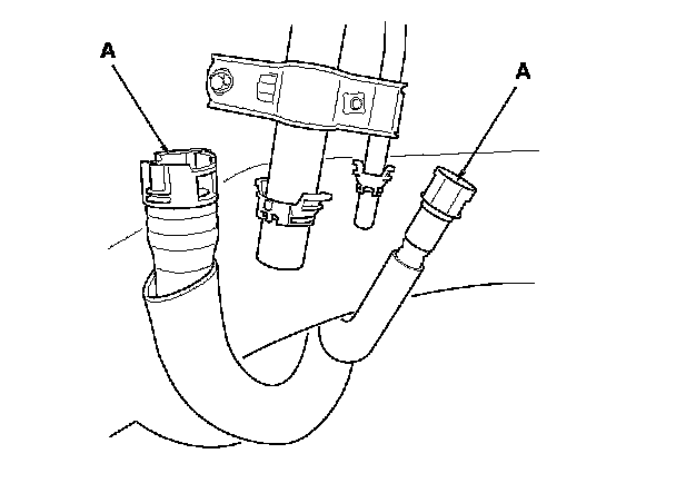 4. Disconnect the quick-connect fittings (A) Fuel Line/Quick-Connect Fitting Removal (and on all models except PZEV, disconnect the fuel fill tube (B) from the fuel fill pipe. Slide back the clamps, then twist the hose as you pull to avoid damaging them).