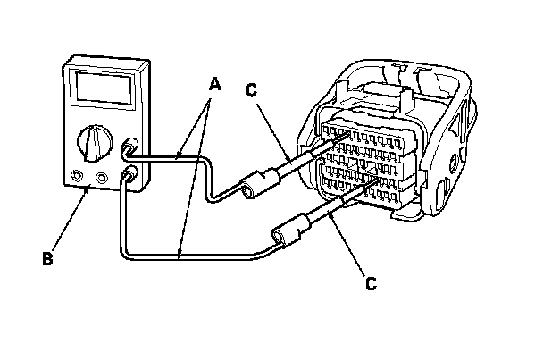 5. Connect one side of the patch cord (A) terminals to a commercially available digital multimeter (B), and connect the other side of the patch cords terminals to a commercially available banana jack (Pomona Electronics Tool No. 3563 or equivalent) (C).