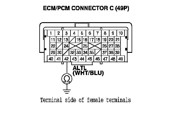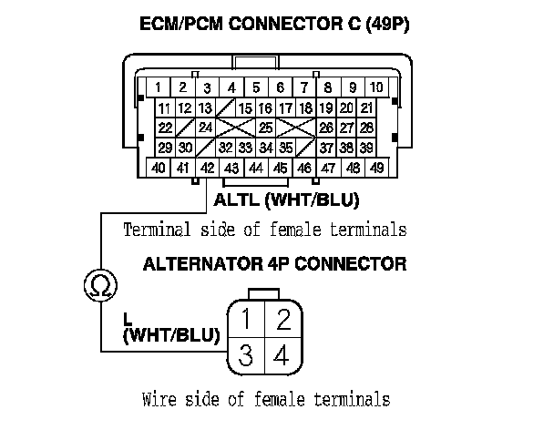 25. Check for continuity between ECM/PCM connector terminal C42 and alternator 4P connector terminal No. 3.