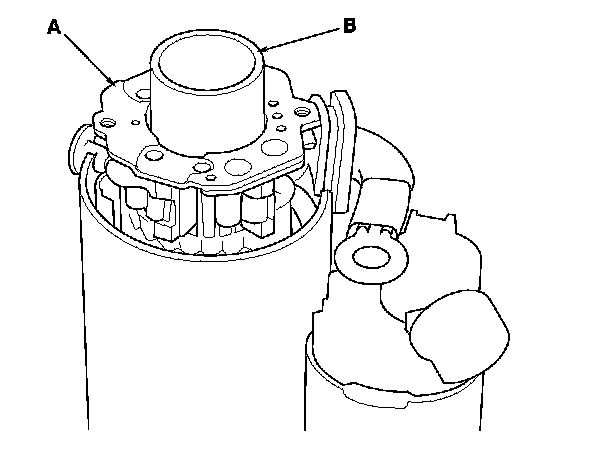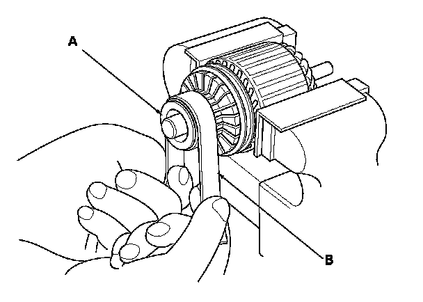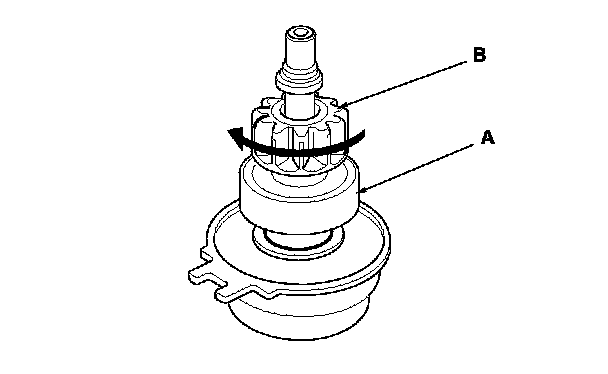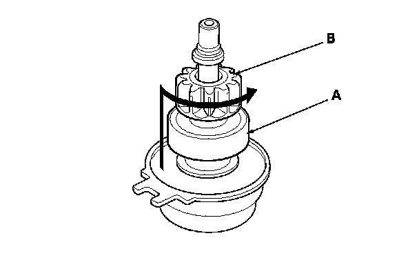 15. Hold the overrunning clutch (A), and turn the drive gear (B) in the direction shown to make sure it turns freely. Also make sure the drive gear locks in the opposite direction. If it does not lock, replace the overrunning clutch assembly.