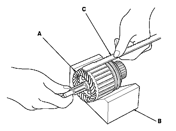 12. Place the armature (A) on an armature tester (B). Hold a hacksaw blade (C) on the armature core. If the blade is attracted to the core or vibrates while the core is turned, the armature is shorted. Replace the armature.