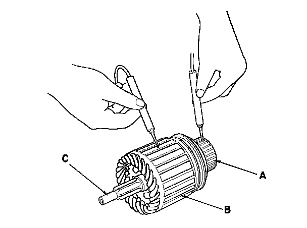 13. Use an ohmmeter to check for continuity between the commutator (A) and the armature coil core (B), and between the commutator and the armature shaft (C). If there is continuity, replace the armature.