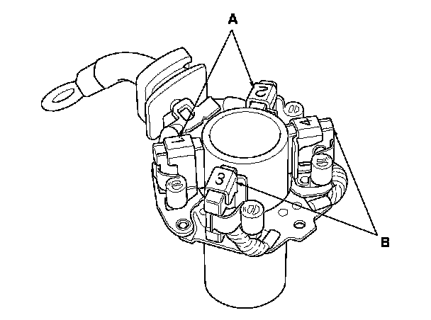 18. Check for continuity between the (+) brushes (A) and the (-) brushes (B). If there is continuity, replace the brush holder assembly.