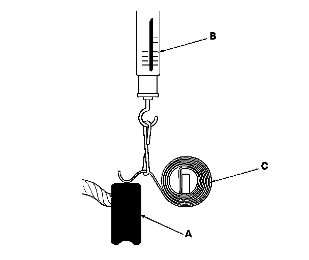 19. Insert the brush (A) into the brush holder, and bring the brush into contact with the commutator, then attach a spring scale (B) to the spring (C). Measure the spring tension at the moment the spring lifts off the brush. If it is not within the standard, replace the brush holder assembly.