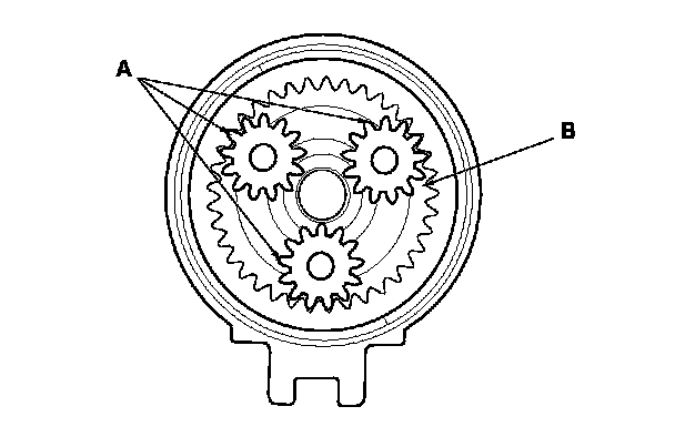 20. Check the planetary gears (A) and the internal ring gear (B). Replace them if they are worn or damaged.