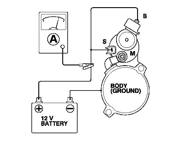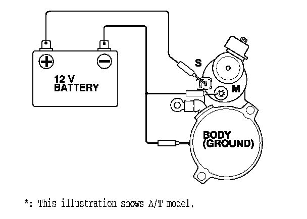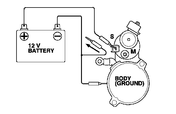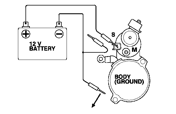 3. Connect the battery as shown. Make sure you disconnect the starter motor wire from the M terminal. If the starter pinion moves out, it is working properly.