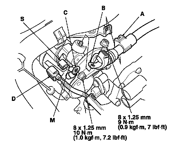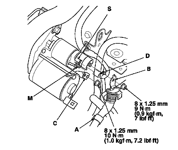 4. Remove the harness clamp (A), then disconnect the positive starter cable (B), the motor wire (C), and the S terminal connector (D).