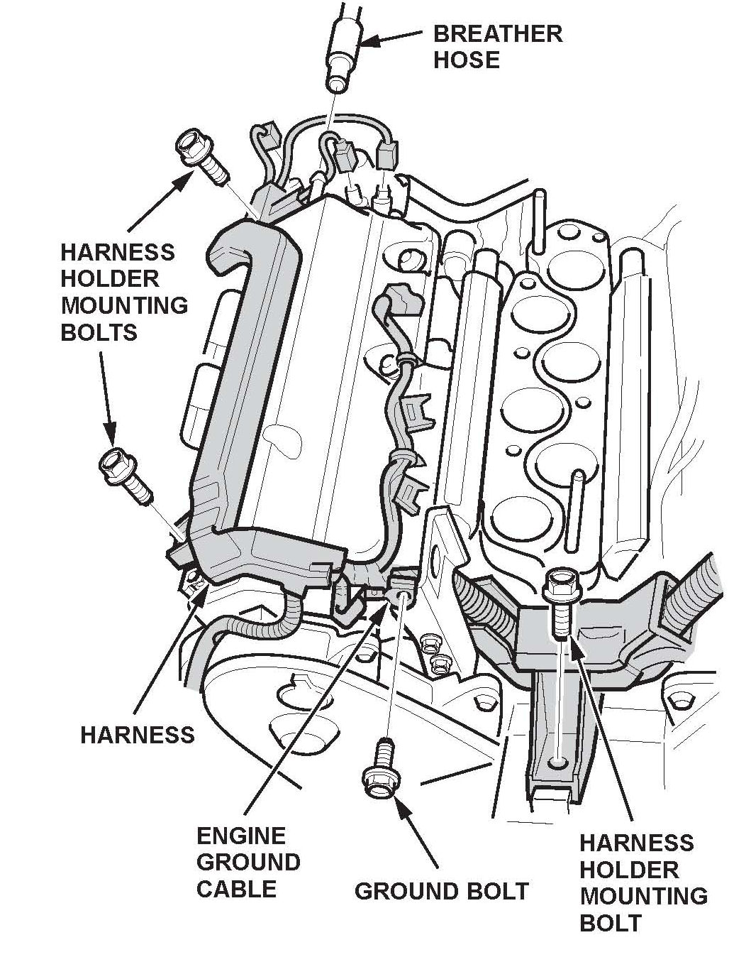 To ease removal of the cylinder head cover, remove the power steering pump with its hoses connected. This allows access to the wire harness mounting bolts.
