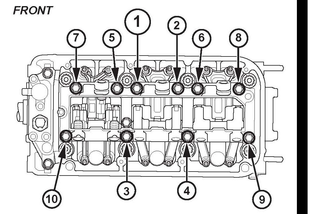 3. Loosen and then torque each rocker shaft bridge bolt again one at a time to 24.5 N.m (18 lb.ft) in the sequence shown above for the front cylinder head.*