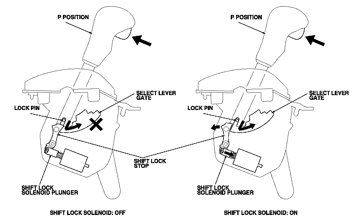 The shift lock system prevents the shift lever from mis-shifting. The shift lock solenoid is usually OFF. After starting the engine in P, the shift lever cannot move to any other position from P because the shift lock stop stops the lock pin unless the brake pedal is pressed. When the brake pedal is pressed and the accelerator pedal is not pressed, the shift lock solenoid is ON; the shift lock solenoid plunger in the shift lock solenoid pulls the shift lock stop to release the lock pin. Pressing the shift lever button allows the shift lever to move to any other position. When the brake pedal and the accelerator pedal are pressed at the same time, the shift lock system is not unlocked.