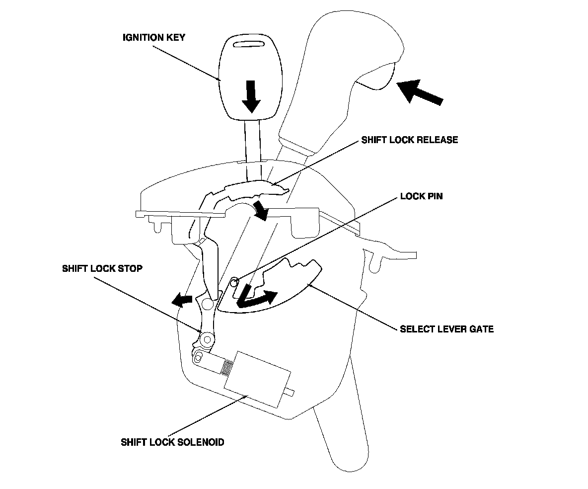When the shift lock system does not operate due to mechanical or electrical trouble, you can unlock the shift lock temporarily by inserting the ignition key into the shift lock release hole and pressing the shift lock release. When the shift lock release is pressed, the shift lock stop releases the lock pin, and the shift lever can move to any other position.