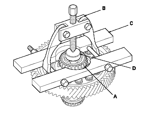 1. Remove the carrier bearing (A) with a commercially available bearing puller (B), a bearing separator (C), and a spacer (D).