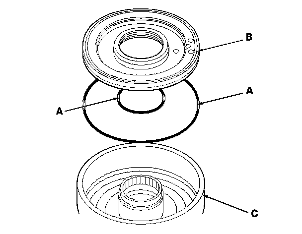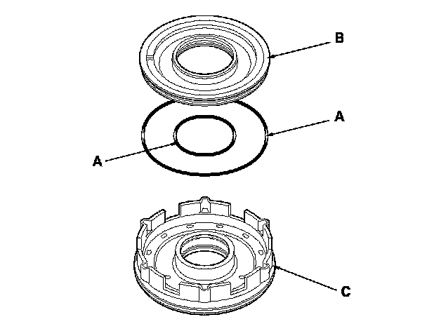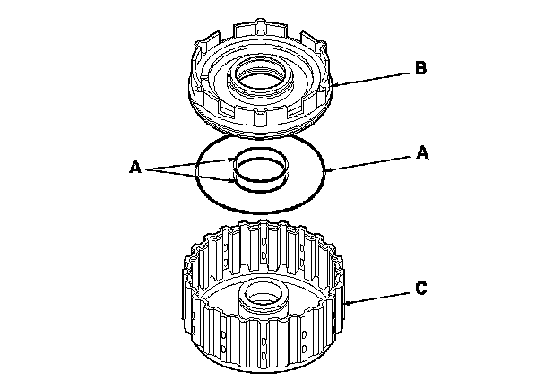 3. Install new O-rings (A) on the 1st clutch piston (B), and install the 1st/1st-hold clutch piston in the 1st/1st-hold clutch drum (C) while applying pressure and rotating to ensure proper seating. Do not pinch the O-ring.