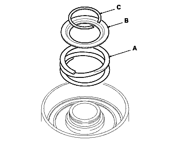 2. Install new O-rings (A) on the 1st-hold clutch piston (B), and install the 1st-hold clutch piston in the 1st clutch piston (C).