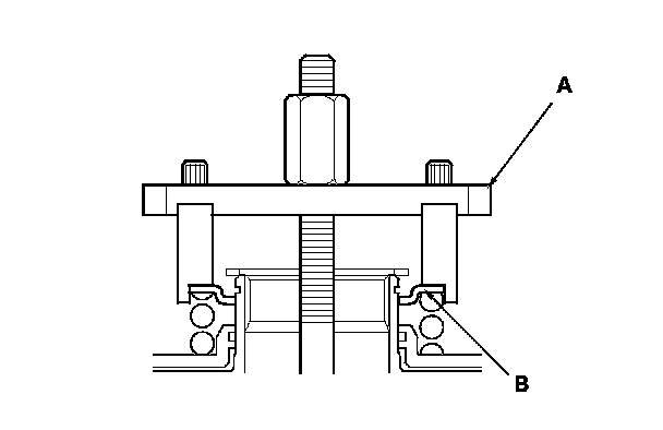 8. Be sure the clutch spring compressor set (A) is adjusted to have full contact with the spring retainer (B) on the 1st, 2nd, and 4th clutches.