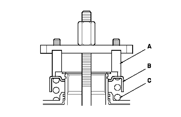 10. Set the clutch spring compressor set (A) on the spring retainer (B) of the 3rd and 5th clutches so that it compresses the clutch return spring (C).