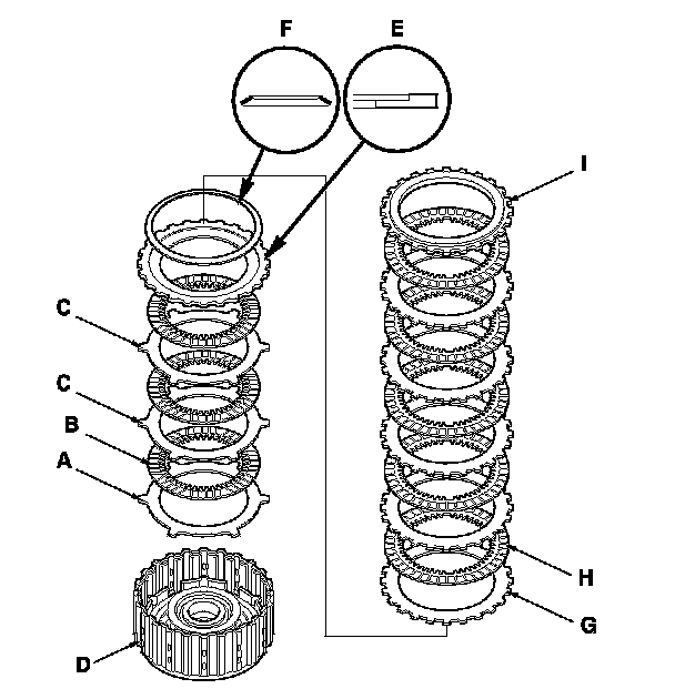 16. Install the disc spring (F) on 1st-hold clutch plate B in the direction shown. Starting with the 1st clutch wave-plate, alternately install the clutch wave-plates (G) (5) and the 1st clutch discs (H) (5), then install the clutch end-plate (I) with the flat side toward the top disc.