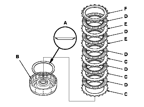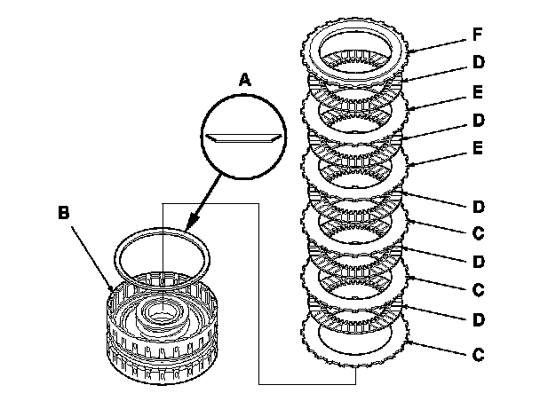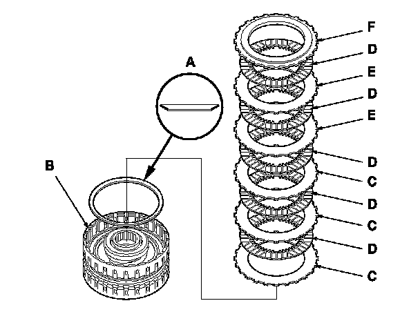 19. Install the disc spring (A) in the 4th clutch drum (B) in the direction shown. Starting with the 4th clutch flat-plate, alternately install the clutch flat-plates (C) (3) and the clutch discs (D) (3), and alternately install the clutch wave-plates (E) (2) and the clutch discs (D) (2). Install the clutch end-plate (F) with the flat side toward the top disc.