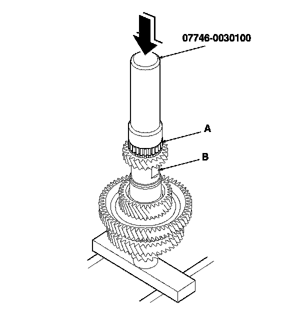 3. Slide the reverse selector hub (A) over the countershaft (B), then press it into place using the 40 mm driver handle and a press.