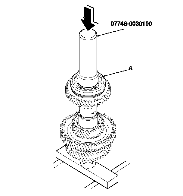 5. Install the ball bearing (A) over the countershaft, then press it into place using the 40 mm driver handle and a press.