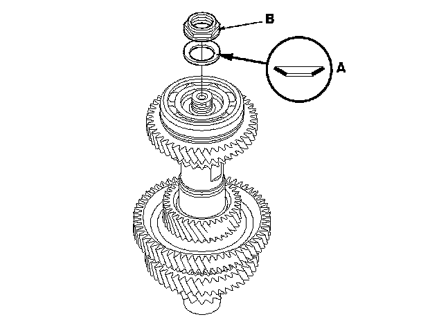 6. Install the conical spring washer (A) in the direction shown, and install a new locknut (B).