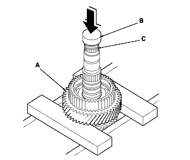 1. Remove the mainshaft 4th gear (A) with the press. Place a spacer (B) between the press and the mainshaft (C) to prevent damaging the mainshaft.