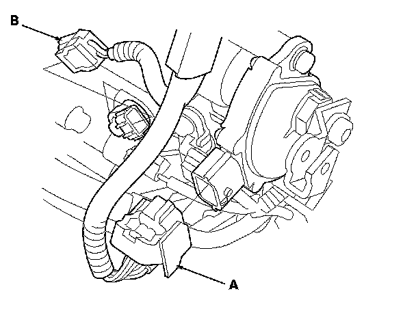 21. Disconnect the transmission range switch connector (A) and the input shaft (mainshaft) speed sensor connector (B).