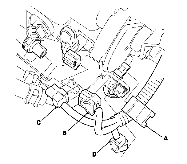 19. Disconnect the A/T clutch pressure control solenoid valve A connector (A), the A/T clutch pressure control solenoid valve B connector (B), the 4th clutch transmission fluid pressure switch connector (C), and the shift solenoid wire harness connector (D).