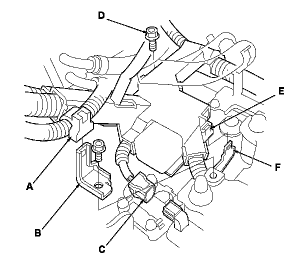 20. Remove the bolt securing the harness cover (E), and remove the harness cover from its bracket (F).