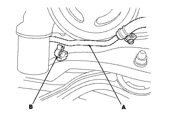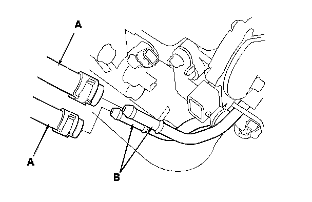 28. Remove the ATF cooler hoses (A) from the ATF cooler lines (B). Turn the ends of the cooler hoses up to prevent ATF from flowing out, then plug the cooler hoses and lines.