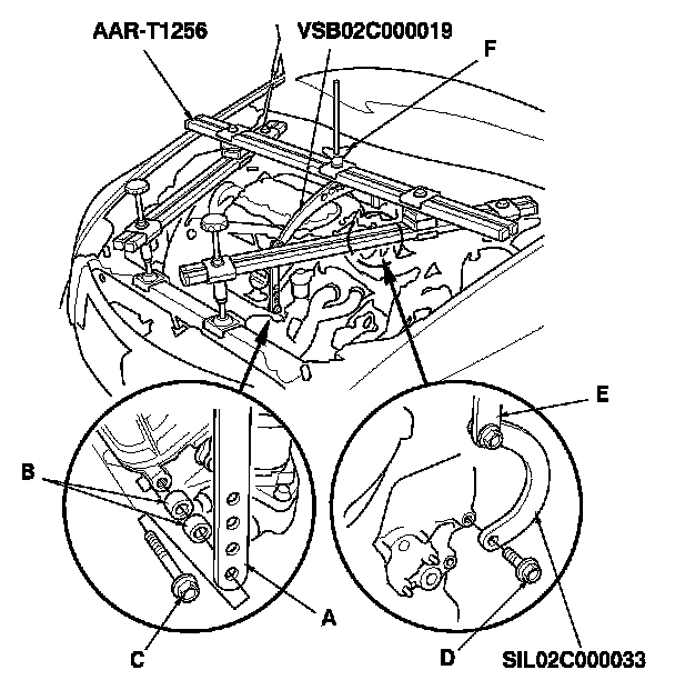 33. Install the engine support hanger (AAR-T1256) to the vehicle, and attach the hook to the engine balancer bar slot. Tighten the wing nut (F) by hand, and lift and support the engine.