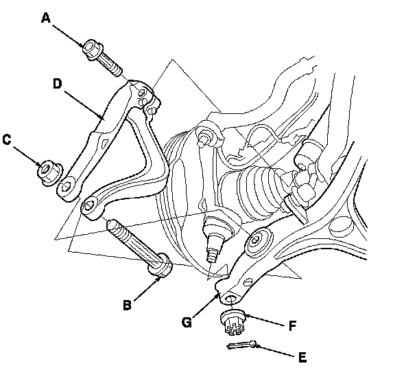 37. Remove the cotter pins (E) and the castle nuts (F), and separate the lower arms (G) from the knuckle. Front Lower Arm Removal/Installation