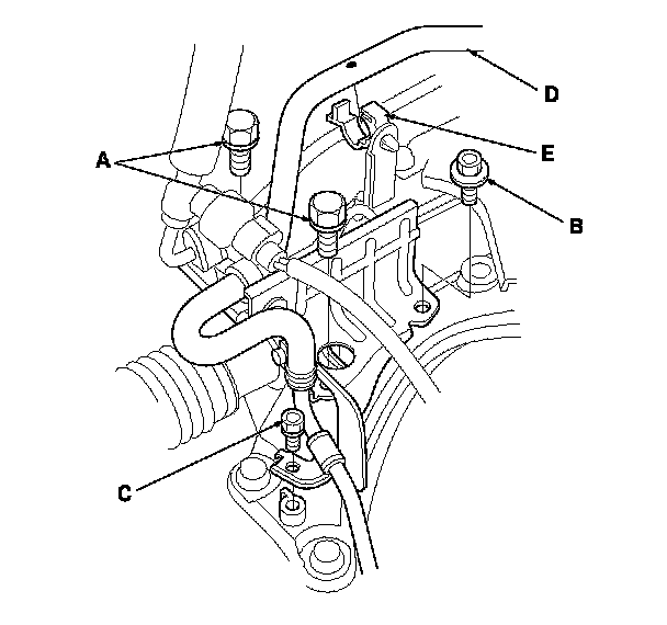 43. Remove the bolt (E) securing the power steering fluid line clamp.