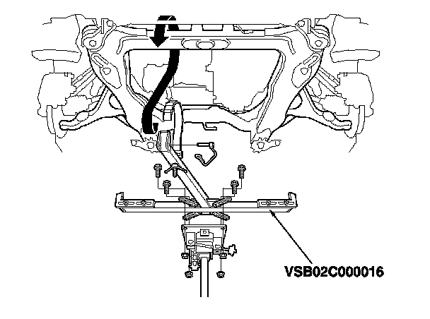 52. Remove the four bolts securing the stiffeners (A) and the four bolts securing the front subframe (B), and lower the front subframe.