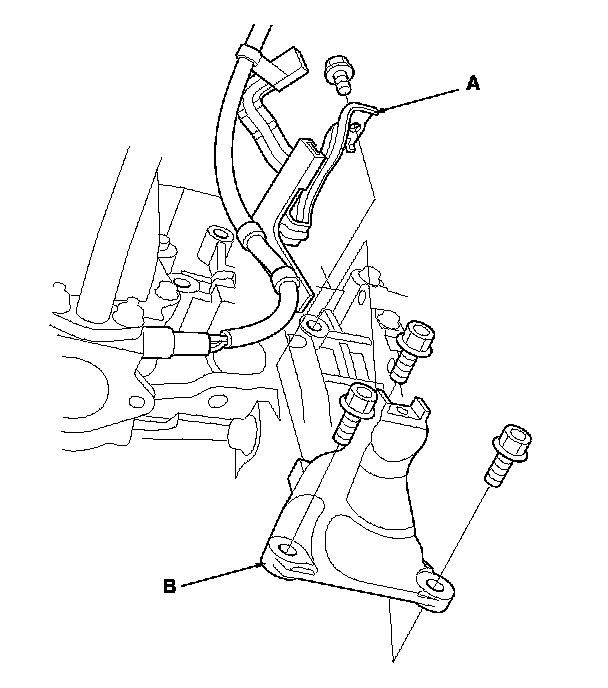 23. Remove the harness clamp (A) from its bracket (B), and remove the bracket.
