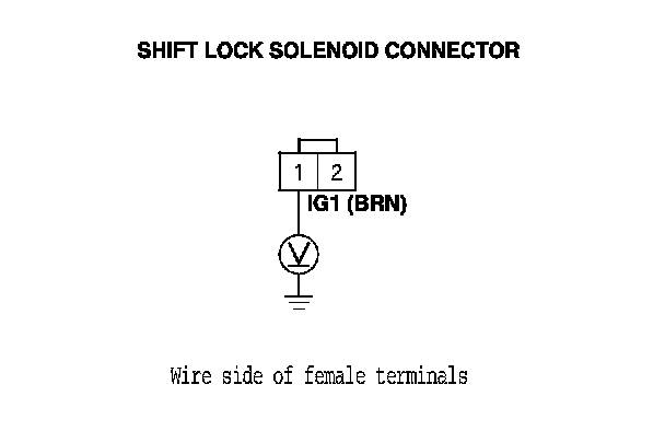 11. Release the brake pedal, and measure the voltage between shift lock solenoid connector terminals No. 1 and No. 2. The shift lever must be in P.