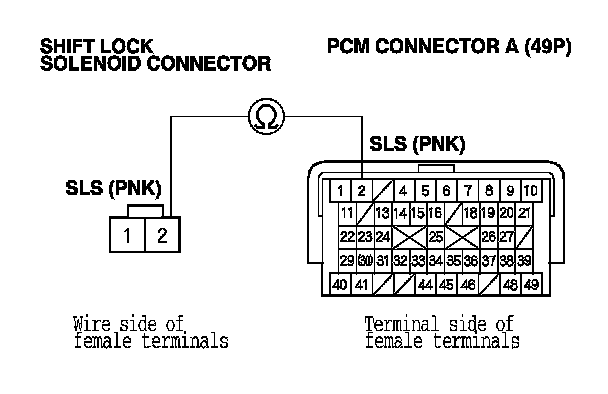 15. Check for continuity between PCM connector terminal A2 and shift lock solenoid connector terminal No. 2.