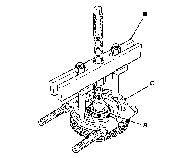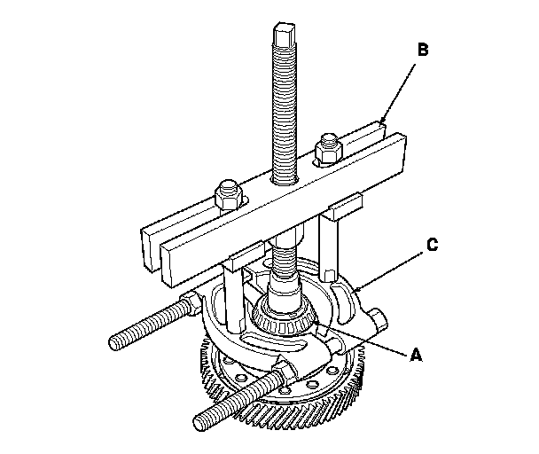 2. Remove the carrier bearings (A) with a commercially available bearing puller (B) and bearing separator (C).