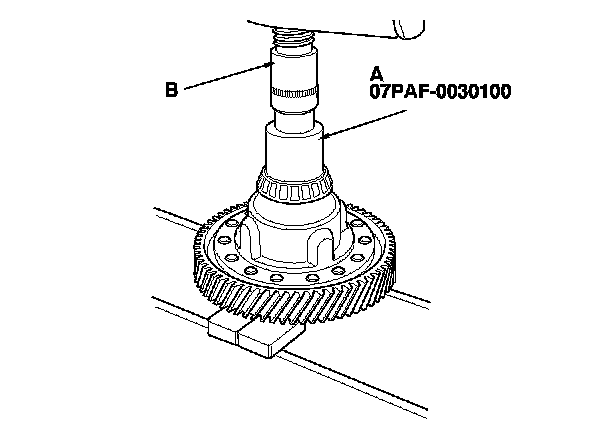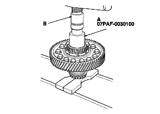3. Install the new bearings with the 22 x 37/46 x 52 mm installer (A) and a press (B). Press on each bearing until it bottoms out. There should be no clearance between the bearings and the differential carrier.
