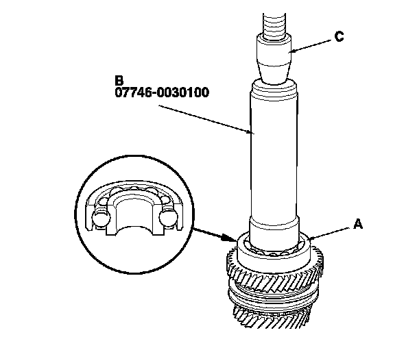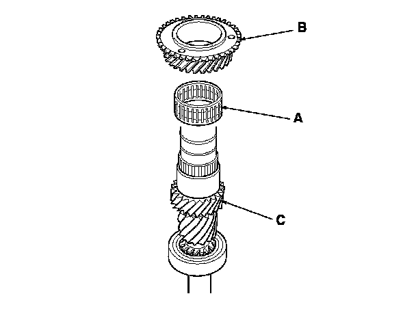 3. Install the needle bearing (A) and 3rd gear (B) onto the mainshaft (C).