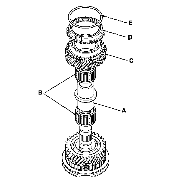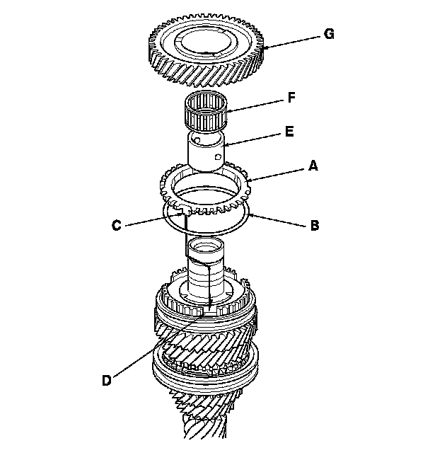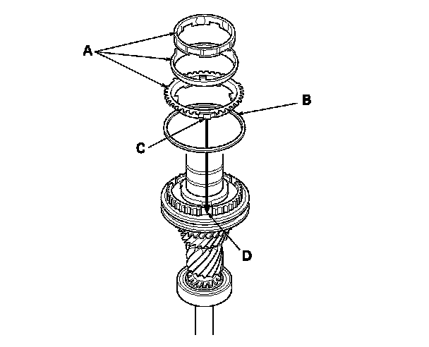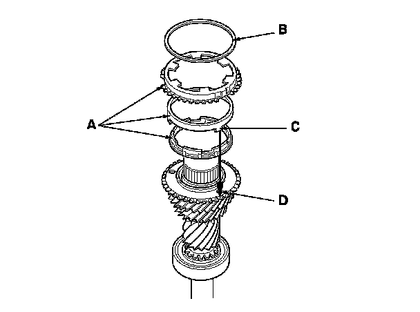 4. Install the double cone synchro assembly (A) with the synchro spring (B) by aligning the synchro cone fingers (C) with the holes (D) in 3rd gear.
