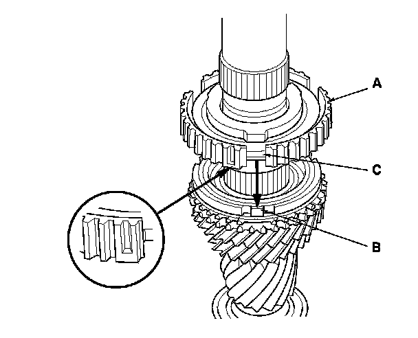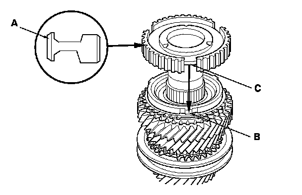 12. Install the 5th/6th synchro hub (A) by aligning the synchro ring fingers (B) with the grooves (C) in the 5th/6th synchro hub.