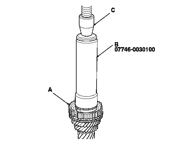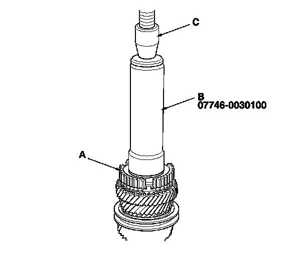 13. Press on the 5th/6th synchro hub (A) using the 40 mm inner driver handle (B) and a press (C).