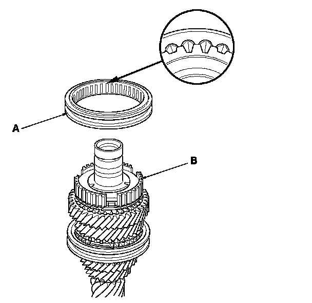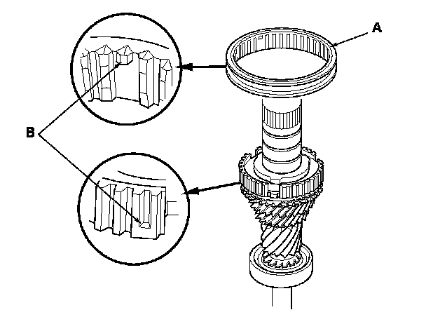 14. Install the 5th/6th synchro sleeve (A) by aligning the slots of the 5th/6th synchro sleeve and the 5th/6th synchro hub (B). After installing, check the operation of the 5th/6th synchro hub set.