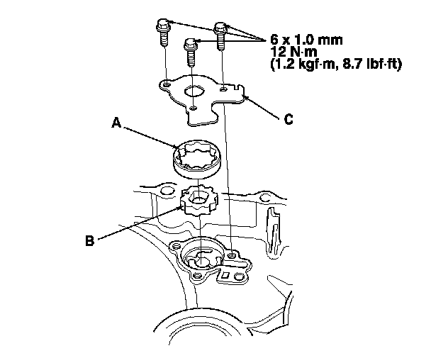 4. Install the oil pump outer rotor (A), the oil pump inner rotor (B), and the oil pump plate (C).