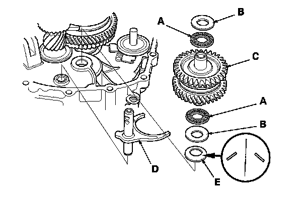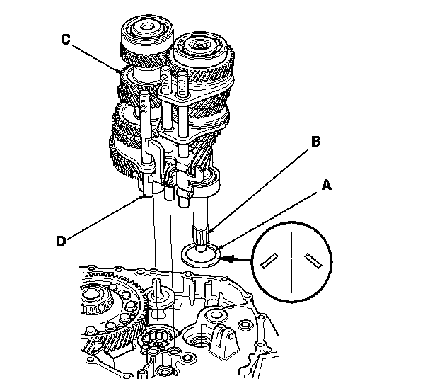 11. Assemble the 20 mm thrust needle bearings (A), the 20 mm thrust washers (B), the reverse idler gear shaft assembly (C), and the reverse shift fork (D). Reverse Idler Gear Shaft Assembly Disassembly/Reassembly