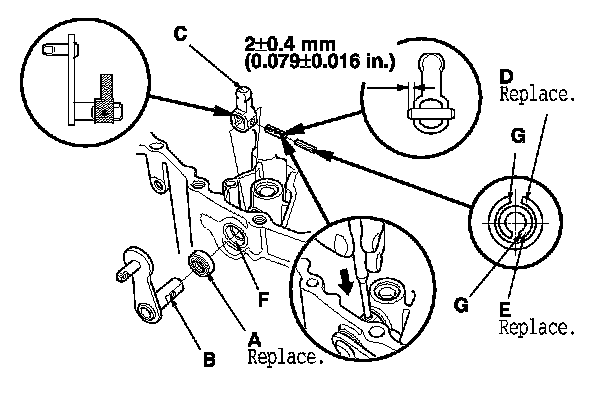 8. Press the new 14 x 20 x 4 mm dust seal (A) into the clutch housing surface, then install the select lever (B), the select arm (C), new 5 x 22 mm spring pin (D), and new 3 x 22 mm spring pin (E).
